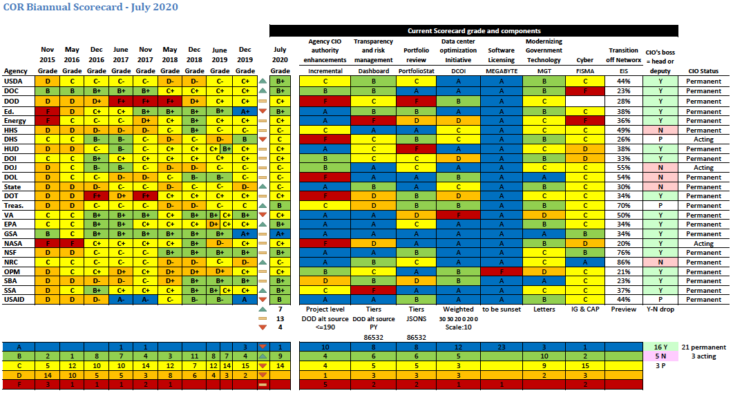Also of note, this scorecard is the first to track agencies’ transition to the $50 billion Enterprise Infrastructure Solutions telecommunications contract off the preceding Networx vehicle. Just a preview, the new category shows agencies’ progress but did not affect scores this time around.