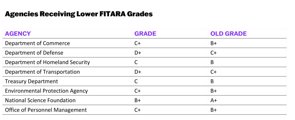 Despite the changes in methodology for FITARA 14.0, 15 agencies’ grades remained the same. That number would have been 20 under the old methodology, and four agencies would have increased their grades.