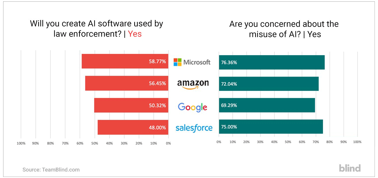 Slightly more than half of the Microsoft, Google and Amazon employees questioned in a survey by anonymous social chat app Blind said they “are willing to create AI software used by law enforcement.” Salesforce and Cisco employees weren’t far behind with 48 percent and 47 percent, respectively, saying they would make AI for law enforcement use.
