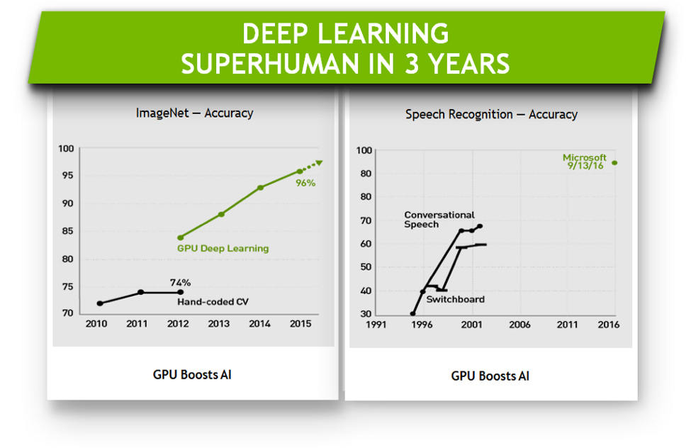 The field of AI has made huge leaps in the last five years. Using Deep learning — a technique where computers teach themselves from massive volumes of data — we have already achieved superhuman results. Take, for example, the field of speech recognition: researchers for the last 20 years had achieved an accuracy rate of only 70%, which was considered unusable. With deep learning on NVIDIA GPUs, Microsoft and Baidu have already surpassed human capability in speech recognition in just 3 years.