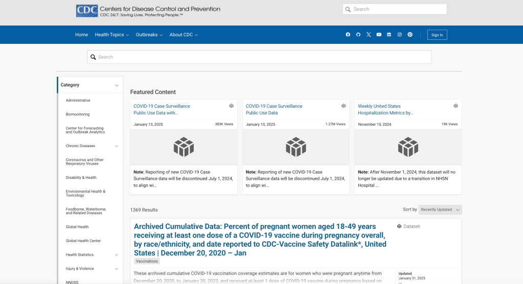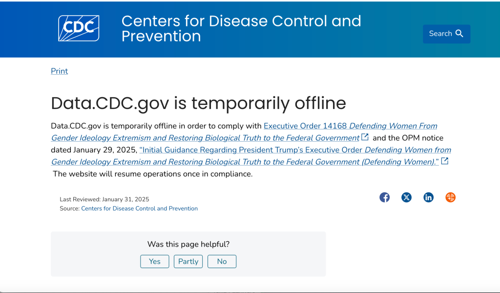 The website that earlier in the day had 1,419 results to browse, per a Wayback Machine capture, was replaced with a note that said “Data.CDC.gov is temporarily offline in order to comply with” Trump’s executive order (EO 14168) on “gender ideology” and the Office of Personnel Management’s memo to agencies on carrying that order out.