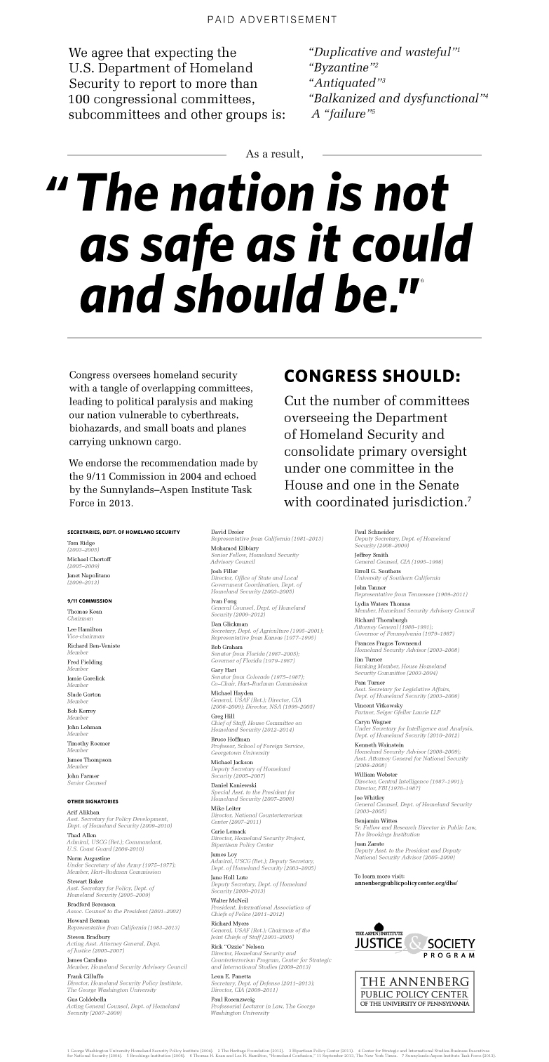 Published as a paid advertisement in The Wall Street Journal, the petition argued “the nation is not as secure as it could be” because of the political paralysis resulting from “a tangle of overlapping committees.”