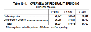 The fiscal 2020 top-line proposal represents a small dip from the estimated $87.97 billion the government plans to have spent on IT by the close of fiscal 2019, according to these latest numbers. Nevertheless, the roughly $182 million proposed cut is a notable one as it marks the first decline in requested top-line funding the IT budget has seen in years.