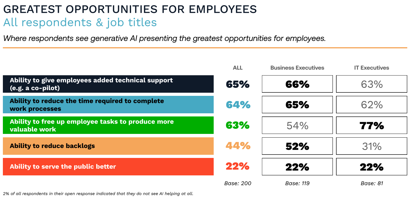 In particular, leaders are eyeing improvements in their business operations and workflows, with 38% expressing confidence that generative AI can enhance efficiency. Close to two-thirds of respondents said they believe generative AI was likely to give employees the ability to reduce the time required to complete work processes and free up time to produce more valuable work.
