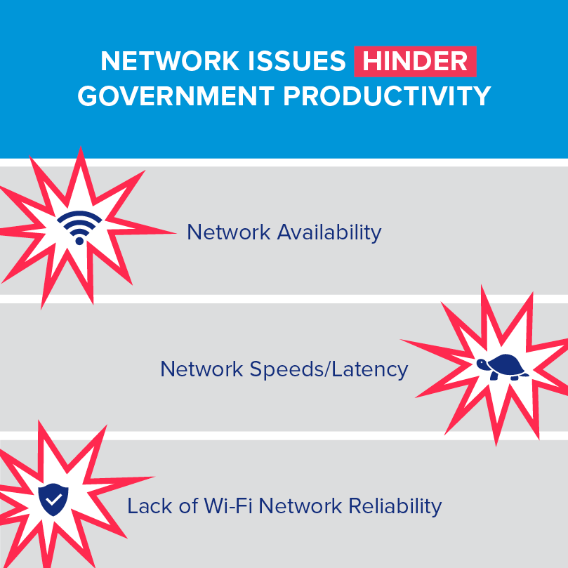 The study also shows network issues among the obstacles to government productivity. Two out of three government IT users report network-related issues when accessing information for work, with network availability, network speeds and lack of reliable Wi-Fi as the top three network-related friction factors.
