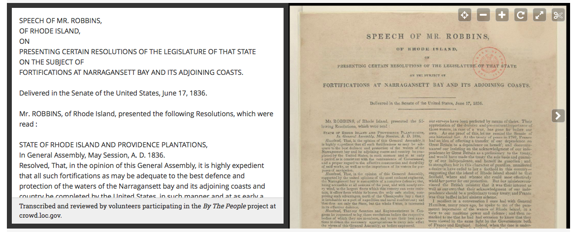 A By the People transcript alongside the digitized original. (Screenshot)