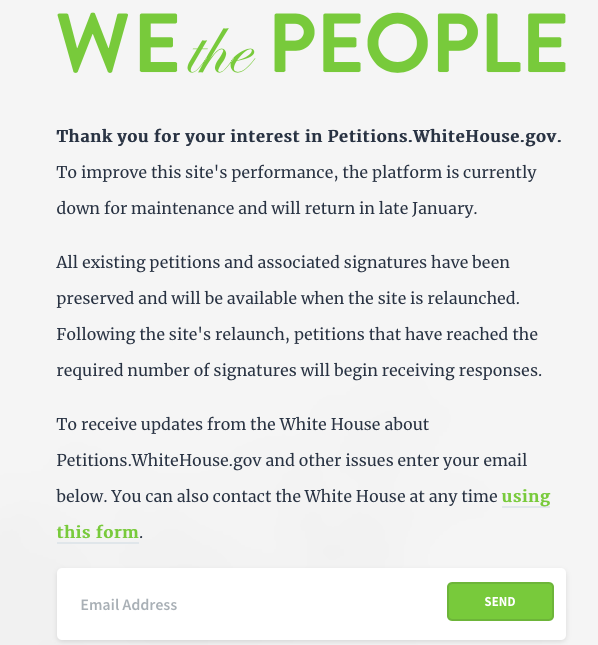 The site was taken down for “maintenance” purposes in December, with the promise that it would return, petitions and signatures intact, in “late January.” As late as the evening of Wednesday, Jan. 31, the petitions.whitehouse.gov web address still only showed a maintenance message. But come the following morning it was back.