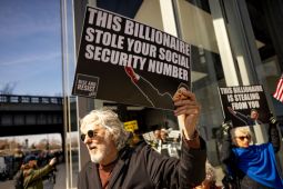 A protester holds a sign that reads: “This billionaire stole your social security number” during a protest at a Manhattan Tesla dealership to demonstrate against Tesla CEO Elon Musk. (Photo by Michael Nigro/Pacific Press/LightRocket via Getty Images)