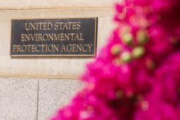 A bronze sign marking the entrance to the Environmental Protection Agency headquarters building is framed in the flowering trees on Sept. 15, 2024, in Washington, D.C. (Photo by J. David Ake/Getty Images)