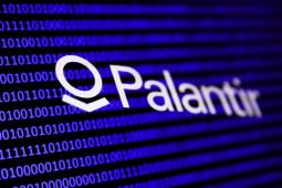 A binary code and Palantir logo are seen in this multpiple exposure illustration photo taken in Krakow, Poland on February 21, 2024. (Photo by Jakub Porzycki/NurPhoto via Getty Images)