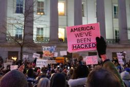 Federal workers and their supporters gather outside the Treasury Department on Feb. 4, 2025, in Washington, D.C., to protest Elon Musk and DOGE’s takeover of federal systems. (Scoop News Group photo by Madison Alder)