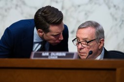 UNITED STATES – MAY 11: Chairman Sen. Richard Durbin, D-Ill., right, and Sen. Josh Hawley, R-Mo., attend a Senate Judiciary Committee markup in Hart Building on Thursday, May 11, 2023. (Tom Williams/CQ-Roll Call, Inc via Getty Images)