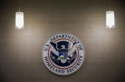 The Department of Homeland Security logo is seen at the ICE Cyber Crimes Center expanded facilities in Fairfax, Va., on July 22, 2015. (Photo by Paul J. Richards/AFP via Getty Images)