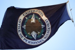 An organizational flag flies outside of the Office of Personnel Management in Washington, D.C. on February 7, 2025 as demonstrators gather to protest federal layoffs and demand the termination of Elon Musk from the Department of Government Efficiency (DOGE). (Photo by Bryan Dozier / Middle East Images / Middle East Images via AFP)