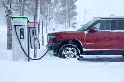 A Rivian truck recharges at a Rivian electric vehicle (EV) charging station during a snowstorm on March 3, 2024 in Truckee, California. (Photo by Mario Tama/Getty Images)