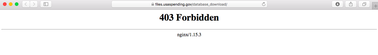 Visitors to the website’s “database download” and “agency submission files” tabs are met with 403 error codes. “Custom account data” and “custom award data,” once necessary fields are filled out and submitted, also yield 403 errors. The “award data archive” page, meanwhile, where users can download “major agencies’ award transaction data for full fiscal years,” simply fails to load any files.