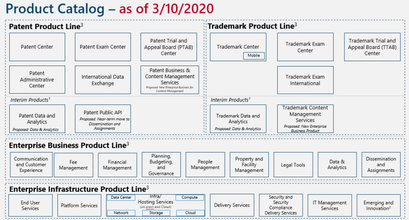 USPTO’s new product catalogue consolidates the number of IT projects underway from more than 150 to just 30 across four product lines: patents, trademarks, enterprise, and infrastructure. Projects range from new software for internal use to products for patent and trademark applicants.